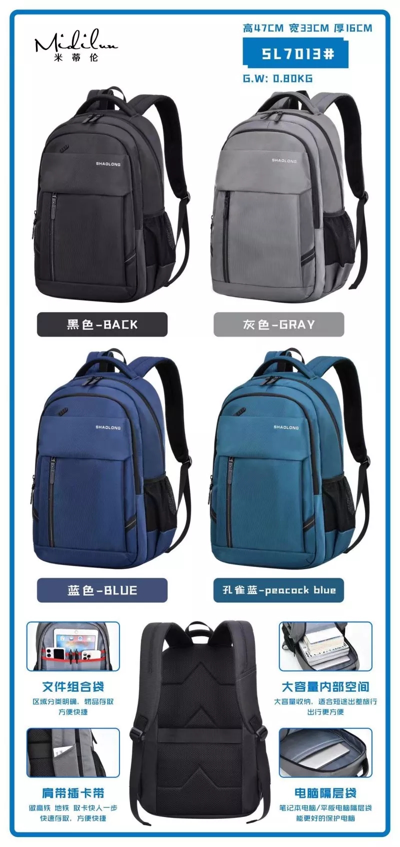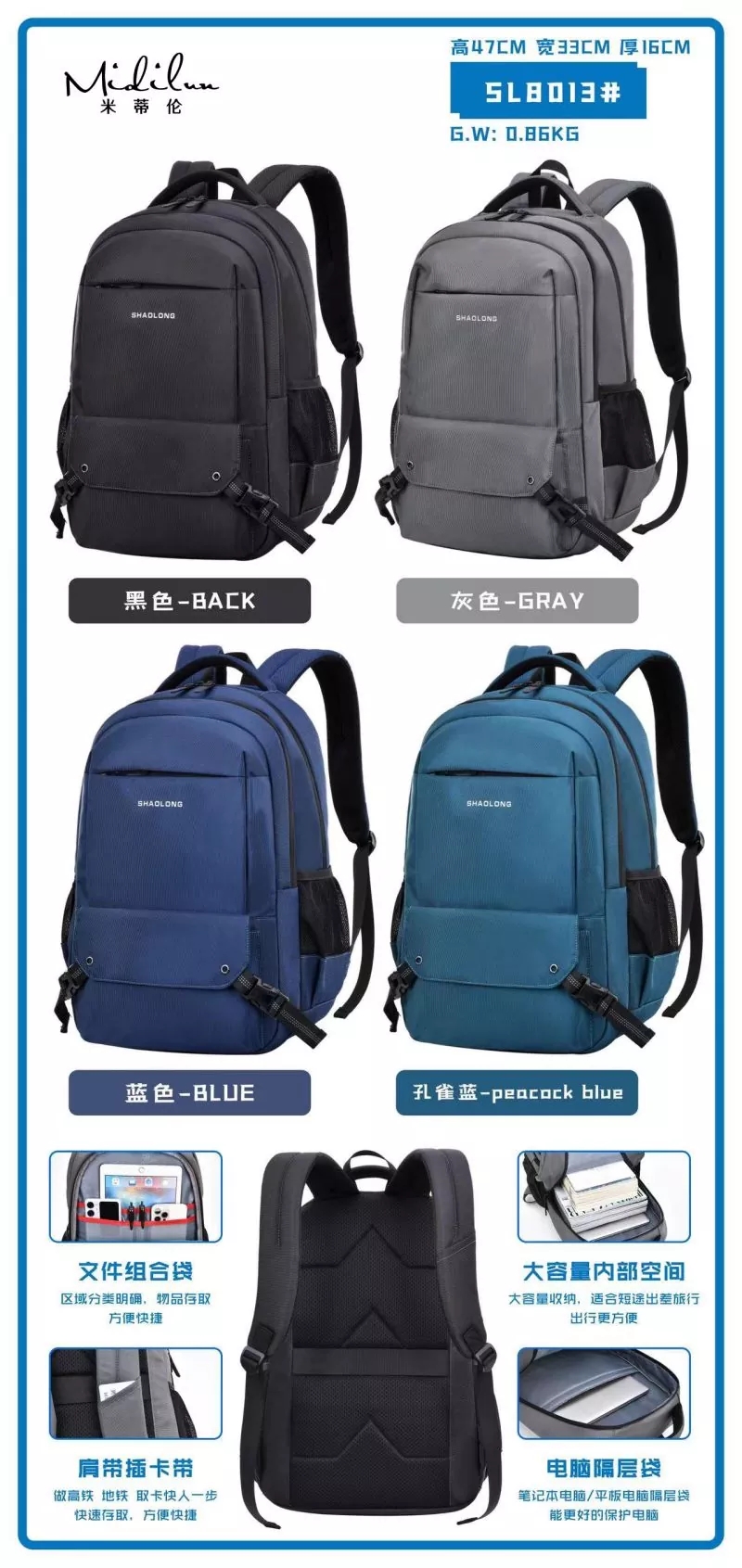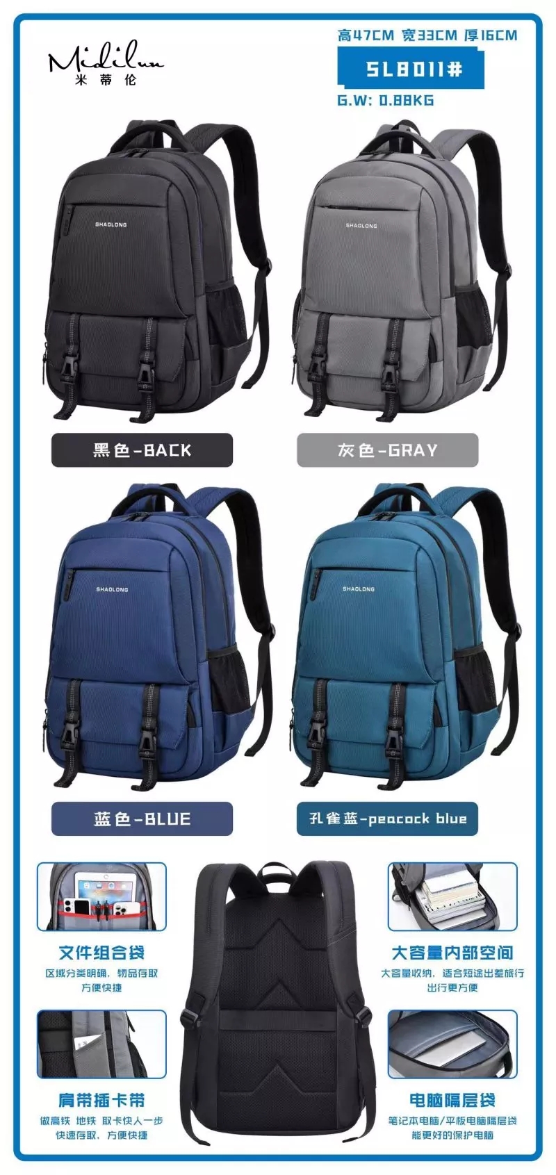 ກະເປົ໋າເດີນທາງທຸລະກິດໃຊ້ການປະສົມປະສານຂອງການອອກແບບຜ້າກັນນ້ໍາແລະຜ້າ Oxford, ເຊິ່ງເປັນສາມມິຕິລະດັບແລະ stylish ຫຼາຍ. ການປະຕິວັດກະເປົ໋າເດີນທາງທຸລະກິດການເພີ່ມຮູຫູຟັງ ແລະອຸປະກອນສາກໄຟແບບພົກພາ USB ເຮັດໃຫ້ກະເປົ໋າເປ້ທັງໝົດມີຄວາມສະດວກສະບາຍໃນການນຳໃຊ້ປະຈໍາວັນ. ຊ່ອງໃສ່ຄອມພີວເຕີທີ່ສາມາດດູດຊຶມໄດ້, ກັນນໍ້າ ແລະ ທົນທານຕໍ່ການສວມໃສ່, ມີ zippers ຄຸນນະພາບສູງ ແລະ ຊ່າງຫັດຖະກໍາທີ່ສວຍງາມ.